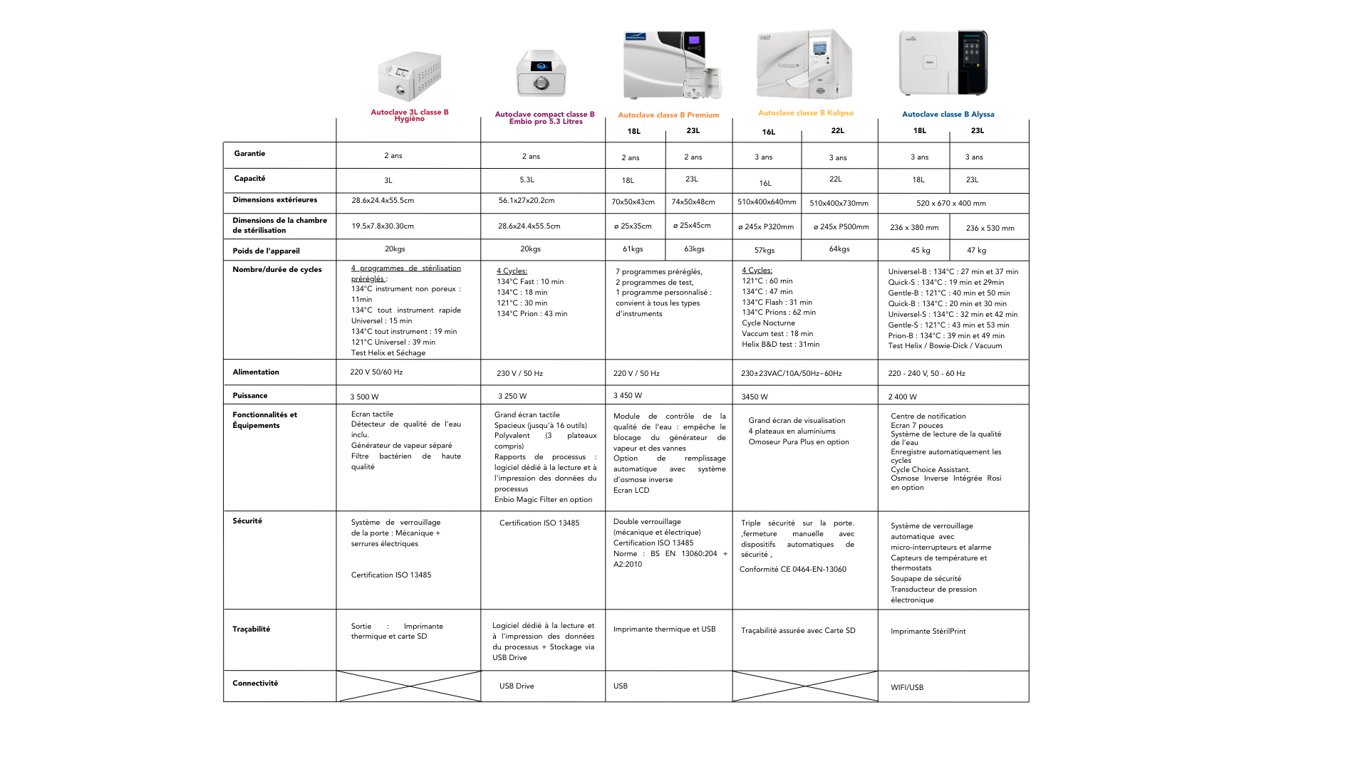 Nous avons pensé à tout : notre tableau comparatif clair et détaillé vous permettra de faire le bon choix en un clin d'œil. Performances, capacités… tout y est pour vous guider efficacement vers l’autoclave qui répondra parfaitement à vos besoins.